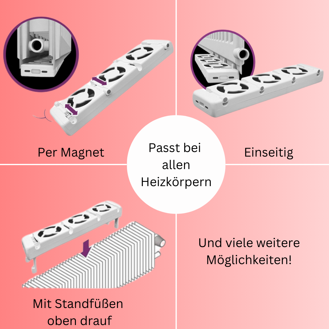CLIP'N'HEAT beschleunigt das Aufheizen Ihres Raums, erlaubt das Senken des Thermostats um 1-2 °C und spart bis zu 22 % Heizkosten. Die einfache Installation und der leise Betrieb machen es zur idealen Lösung für effizientes Heizen und mehr Komfort in Ihrem Zuhause. Steigern Sie die Wärmeffizienz und genießen Sie gleichzeitig eine angenehme Raumtemperatur – mit dem CLIP'N'HEAT Heizkörperventilator Single Set.
